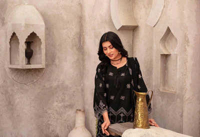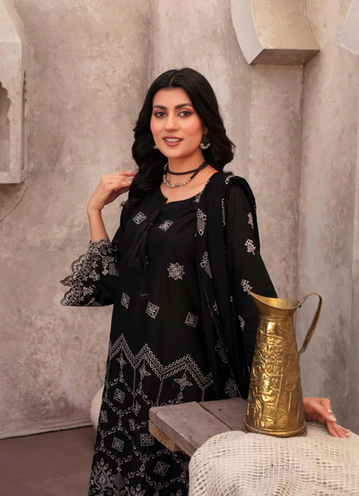 Bring sophistication to your wardrobe with this black embroidered 3 piece lawn suit from Tabeer Collection Vol 5 by Zuni Collection SDK. Featuring a finely embroidered lawn shirt, a matching black fancy lawn dupatta, and a soft cambric trouser – perfect for festive wear, summer gatherings, and special occasions. Zuni Collection SDK